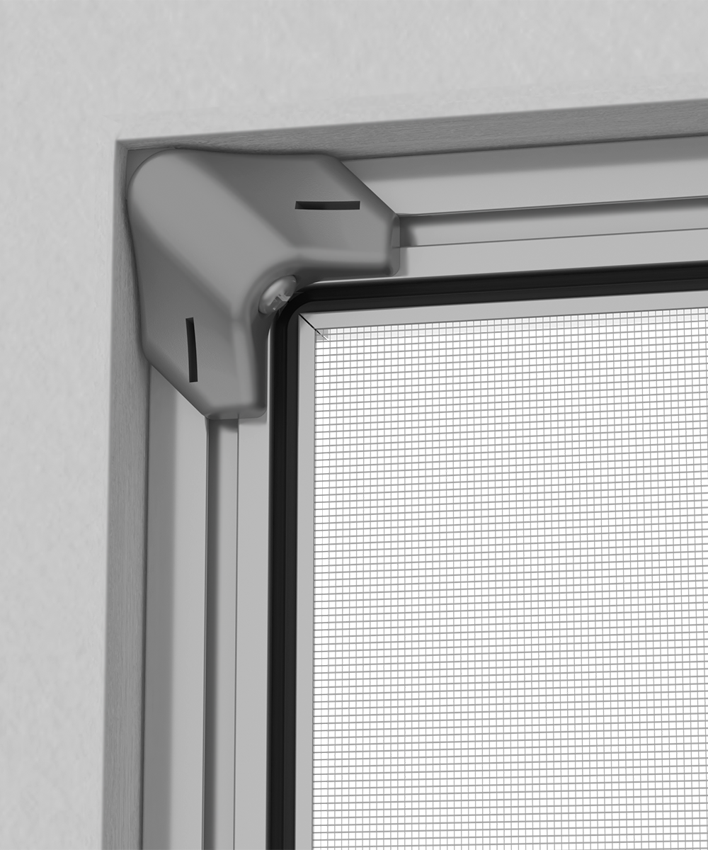 Il sistema si incastra saldamente nei solchi del telaio e, con un semplice cacciavite, permette di regolare il perno fino a farlo aderire perfettamente alla parete, fissando la zanzariera con stabilità